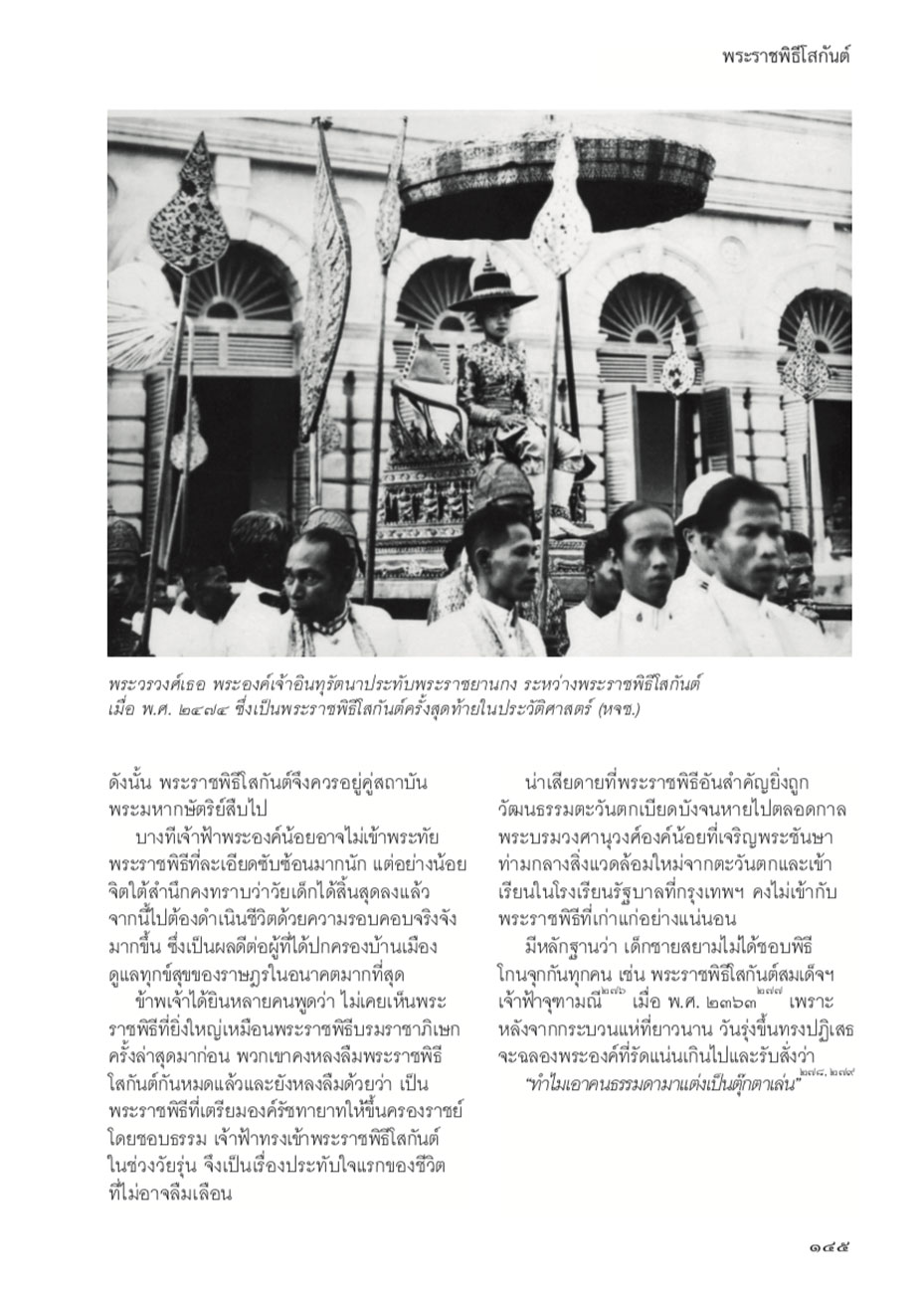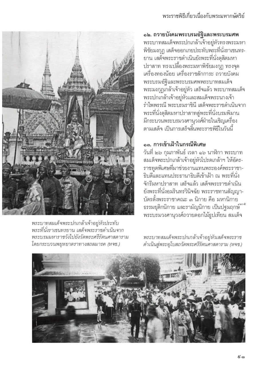เนื้อหาในเล่มนี้จะเน้นพระราชพิธีบรมราชาภิเษกและพระราชพิธีถวายพระเพลิงพระบรมศพ ซึ่งเป็นพระราชพิธียิ่งใหญ่และสำคัญต่อพระมหากษัตริย์ไทย เป็นพิเศษ รวมทั้งพระราชพิธีสำคัญอื่นๆ เช่น พระราชพิธีโสกันต์ พระราชพิธีตรียัมพวาย ตรีปวาย พระราชพิธีพืชมงคลจรดพระนังคัลแรกนาขวัญ ซึ่งผู้แต่งก็ได้อธิบายขั้นตอนอย่างชัดเจนและให้รายละเอียดปลีกย่อยที่น่าสนใจ